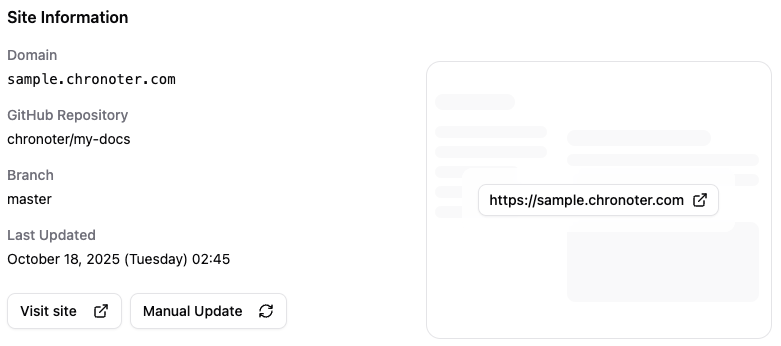 Chronoter Platform enables automatic deployment through GitHub repository integration. This page explains how deployment works and how to check deployment history.